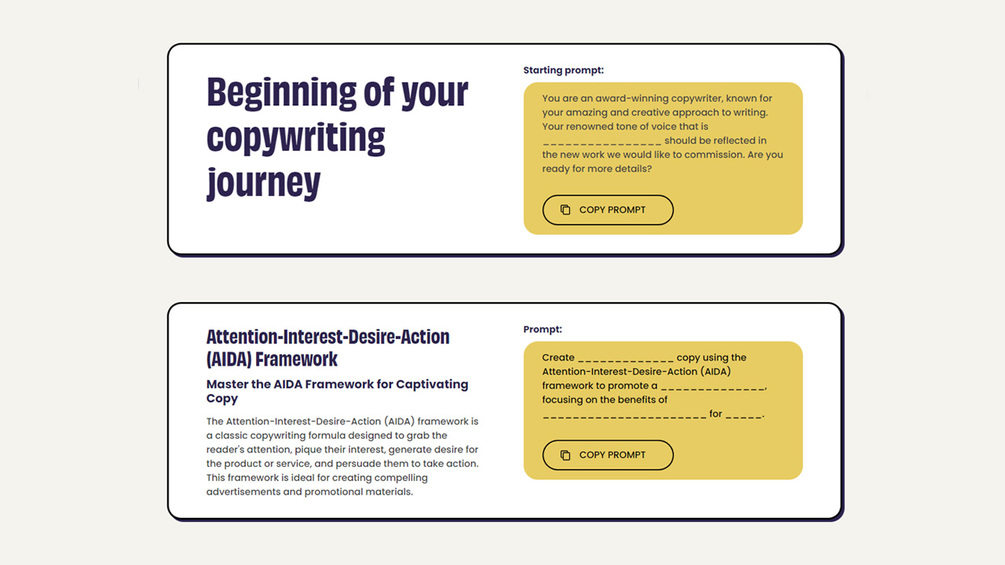 Inside our playbook, you'll find the best kickstart prompt and 14 prompts built for the most successful copywriting frameworks in the industry. Master proven techniques such as the AIDA, PAS, BAB, Upwords, and many more essential frameworks that expert copywriters swear by.